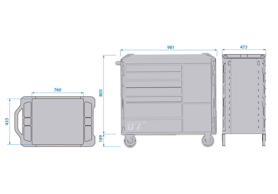 Wymiary szuflad: 1 x 270 x 380 x 380 mm. Wymiary kółek: 5” x 2”. Waga wózka: 103 kg.