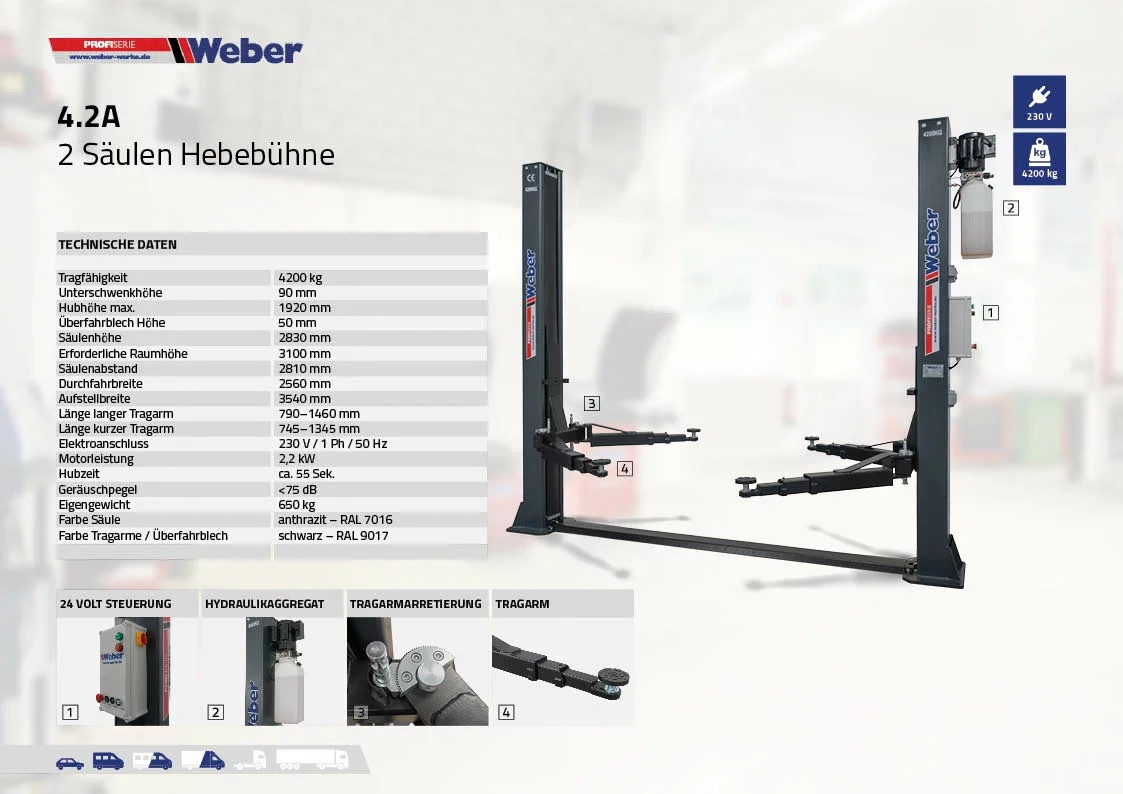 Podnośnik dwukolumnowy 4,2T do aut osobowych i większych typu SUV ramiona 3×3 Weber Profi Series 4.2A