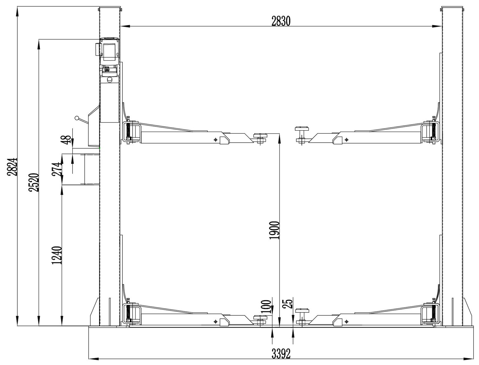System zapadek zabezpieczających aktywuje się automatycznie w trakcie podnoszenia auta. Ponadto, wyłącznik krańcowy zatrzymuje proces podnoszenia w momencie, gdy podnośnik osiąga maksymalną wysokość. Wyłącznik krańcowy zamontowany jest również w najniższym położeniu wózków podnośnika, dzięki czemu przeciążenia układu hydraulicznego zostały zredukowane do minimum. Dodatkowo, wózki podnośnika wyposażone są w gumowe zabezpieczenia, chroniące drzwi pojazdu przed uszkodzeniem. Podnośnik wyposażony jest także w ostrzegawczy sygnalizator dźwiękowy informujący personel o pracy podnośnika w czasie gdy pojazd jest opuszczany. Na pulpicie sterowniczym znajduje się też wyłącznik awaryjny, który pozwoli na natychmiastowe przerwanie pracy podnośnika w niebezpiecznej sytuacji.
