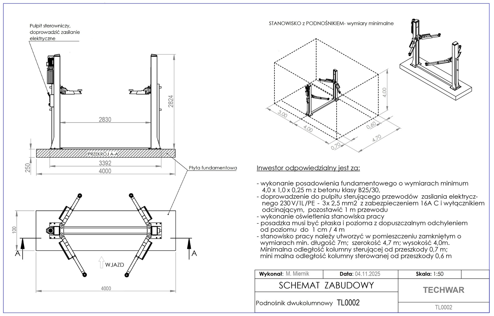 Podstawowe wymagania dotyczące przygotowania podłoża pod montaż podnośnika dwukolumnowego: