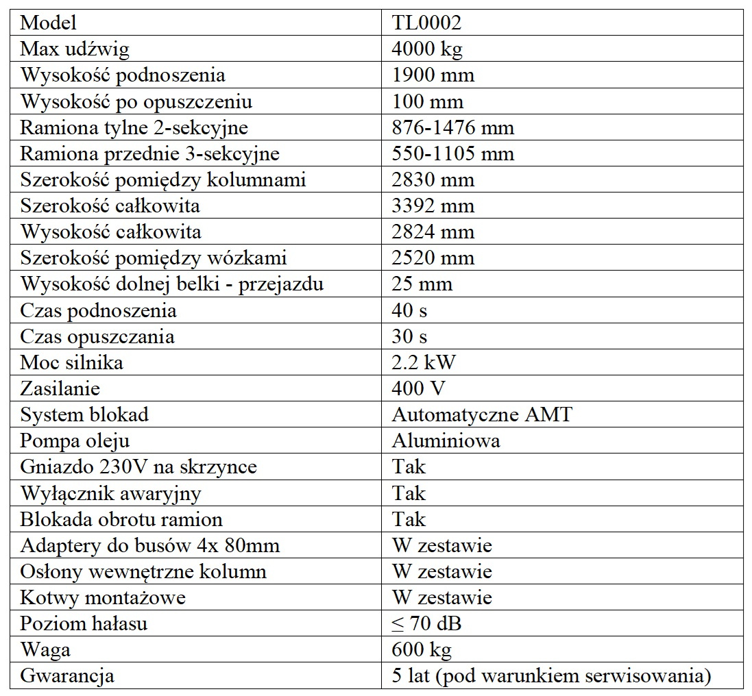 Głównymi zaletami prezentowanego modelu są precyzyjne wykonanie, solidna konstrukcja oraz niezawodne podzespoły ( wszystkie nasze podnośniki wyposażone są w aluminiowe pompy oleju ). Podnośnik wyposażony jest w system AMT. Automatyczna dźwignia AMT nie służy jedynie do podnoszenia i opuszczania pojazdów, ale jednocześnie zwalnia blokady bezpieczeństwa. Podnośnik TL0002 podnosi na 1900mm, ma niski przejazd 25mm, jest wyposażony w osłony kolumn oraz gniazdo 230V na skrzynce sterującej. Przednie ramiona posiadają 3-sekcyjną konstrukcję teleskopową. Najkrótszy rozstaw ramion (550mm) umożliwia podnoszenie małych pojazdów osobowych. Maksymalny rozstaw ramion (1476mm) jest niezbędny do stabilnego ustawienia i bezpiecznej obsługi aut dostawczych. Ramiona w podnośniku są asymetryczne i rozkładają się na zewnątrz, dzięki czemu możliwe jest zachowanie optymalnej równowagi podnoszonego pojazdu. W standardowym wyposażeniu podnośnika znajduje się komplet dystansów o wysokości 80mm. Są one niezbędne przy obsłudze aut dostawczych z plandeką, oraz samochodów terenowych podnoszonych za ramę. Podpory umieszczane pod pojazdem są wykręcane oraz wpinane na zatrzask do ramion i dystansów.