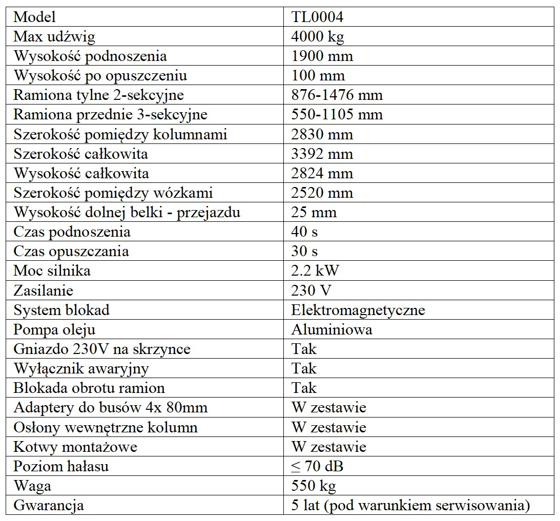 Głównymi zaletami prezentowanego modelu są precyzyjne wykonanie, solidna konstrukcja oraz niezawodne podzespoły ( wszystkie nasze podnośniki wyposażone są w aluminiowe pompy oleju ). Podnośnik TL0004 wyposażony jest w system blokad elektromagnetycznych, podnosi na 1900mm, ma niski przejazd 25mm, jest wyposażony w osłony kolumn oraz gniazdo 230V na skrzynce sterującej. Przednie ramiona posiadają 3-sekcyjną konstrukcję teleskopową. Najkrótszy rozstaw ramion (550mm) umożliwia podnoszenie małych pojazdów osobowych. Maksymalny rozstaw ramion (1476mm) jest niezbędny do stabilnego ustawienia i bezpiecznej obsługi aut dostawczych. Ramiona w podnośniku są asymetryczne i rozkładają się na zewnątrz, dzięki czemu możliwe jest zachowanie optymalnej równowagi podnoszonego pojazdu. W standardowym wyposażeniu podnośnika znajduje się komplet dystansów o wysokości 80mm. Są one niezbędne przy obsłudze aut dostawczych z plandeką, oraz samochodów terenowych podnoszonych za ramę. Podpory umieszczane pod pojazdem są wykręcane oraz wpinane na zatrzask do ramion i dystansów.