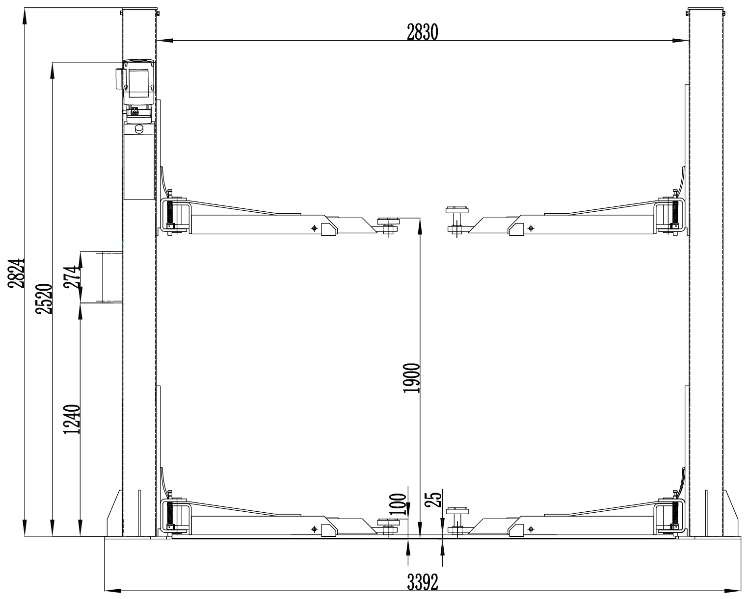 System zapadek zabezpieczających aktywuje się automatycznie w trakcie podnoszenia auta. Ponadto, wyłącznik krańcowy zatrzymuje proces podnoszenia w momencie, gdy podnośnik osiąga maksymalną wysokość. Wyłącznik krańcowy zamontowany jest również w najniższym położeniu wózków podnośnika, dzięki czemu przeciążenia układu hydraulicznego zostały zredukowane do minimum. Dodatkowo, wózki podnośnika wyposażone są w gumowe zabezpieczenia, chroniące drzwi pojazdu przed uszkodzeniem. Podnośnik wyposażony jest także w ostrzegawczy sygnalizator dźwiękowy informujący personel o pracy podnośnika w czasie gdy pojazd jest opuszczany. Na pulpicie sterowniczym znajduje się też wyłącznik awaryjny, który pozwoli na natychmiastowe przerwanie pracy podnośnika w niebezpiecznej sytuacji.
