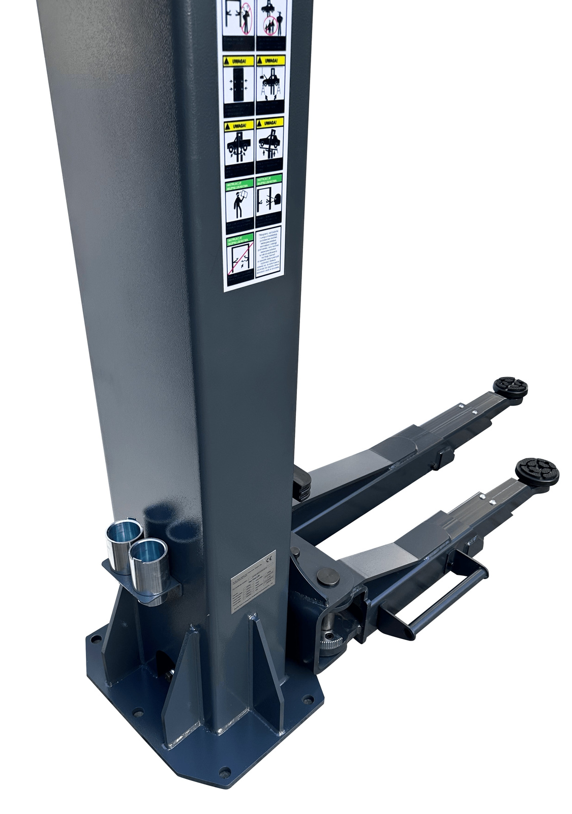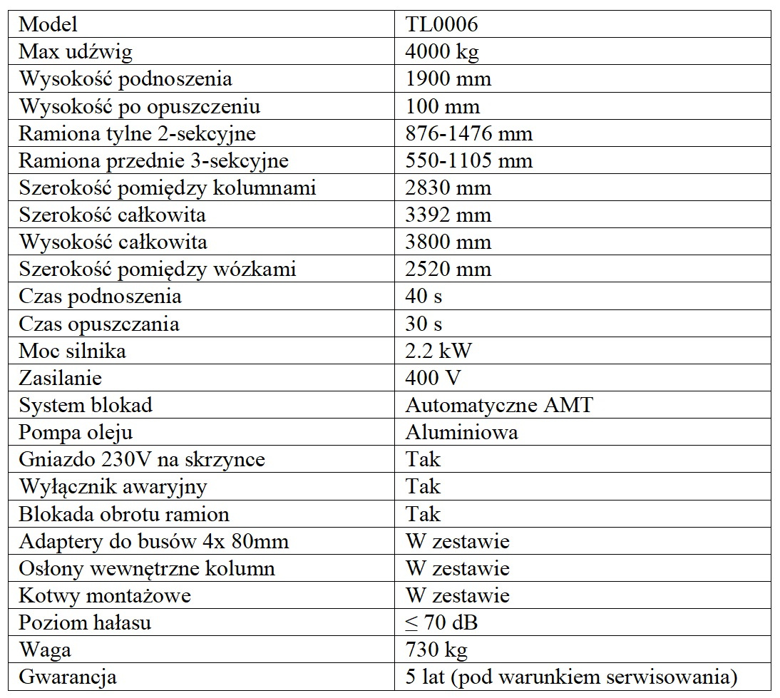 Głównymi zaletami prezentowanego modelu są precyzyjne wykonanie, solidna konstrukcja oraz niezawodne podzespoły ( wszystkie nasze podnośniki wyposażone są w aluminiowe pompy oleju ). Podnośnik wyposażony jest w system AMT. Automatyczna dźwignia AMT nie służy jedynie do podnoszenia i opuszczania pojazdów, ale jednocześnie zwalnia blokady bezpieczeństwa. Podnośnik TL0006 podnosi na 1900mm, jest wyposażony w osłony kolumn oraz gniazdo 230V na skrzynce sterującej. Przednie ramiona posiadają 3-sekcyjną konstrukcję teleskopową. Najkrótszy rozstaw ramion (550mm) umożliwia podnoszenie małych pojazdów osobowych. Maksymalny rozstaw ramion (1476mm) jest niezbędny do stabilnego ustawienia i bezpiecznej obsługi aut dostawczych. Ramiona w podnośniku są asymetryczne i rozkładają się na zewnątrz, dzięki czemu możliwe jest zachowanie optymalnej równowagi podnoszonego pojazdu. W standardowym wyposażeniu podnośnika znajduje się komplet dystansów o wysokości 80mm. Są one niezbędne przy obsłudze aut dostawczych z plandeką, oraz samochodów terenowych podnoszonych za ramę. Podpory umieszczane pod pojazdem są wykręcane oraz wpinane na zatrzask do ramion i dystansów.