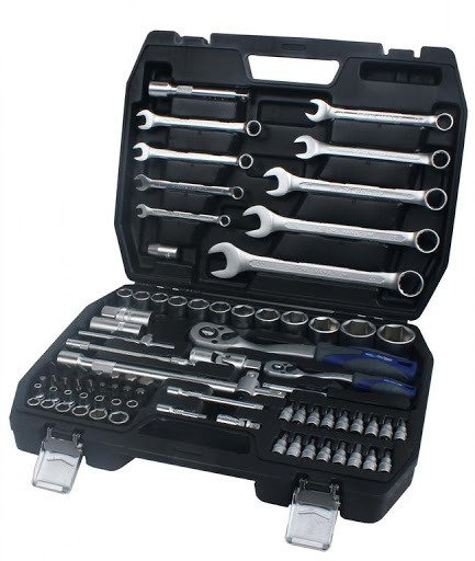 Nowość w naszej ofercie, wysokiej jakości zestaw kluczy zapadkowych 1/4" i 1/2" z kompletem krótkich nasadek, kluczy płasko-oczkowych, bitów i innych narzędzi.