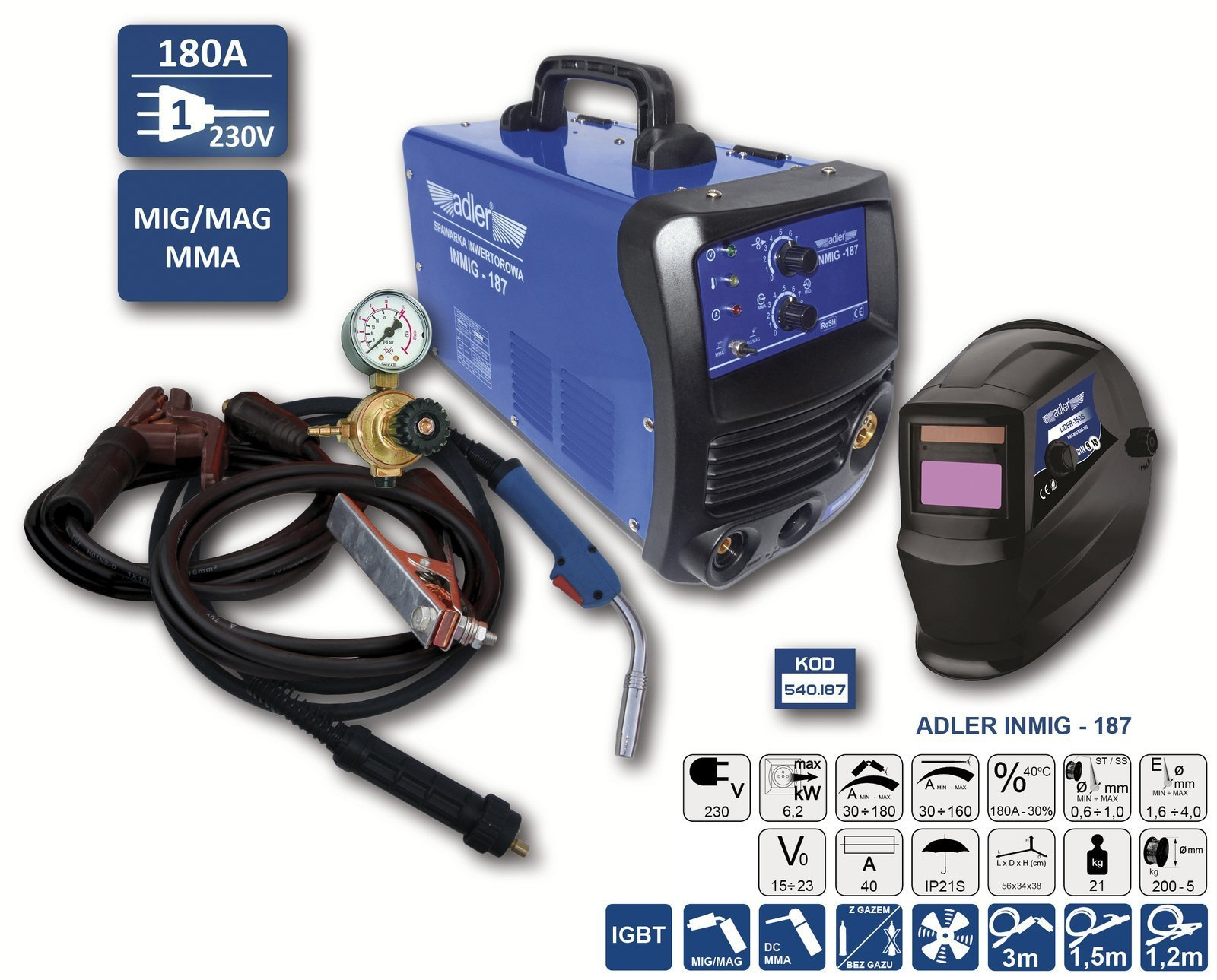 Urządzenie Adler INMIG-187 posiada płynną, bezstopniową regulację napięcia i natężenia prądu oraz prędkości podawania drutu. Zastosowanie gniazda EURO pozwala na podpięcie każdego przewodu MIG z EURO złączem bez konieczności demontażu urządzenia. Długość przewodu z palnikiem MIG - 3m. Możliwość spawania bez osłony gazu drutem typu FLUX (konieczne przełączenie przewodów w okolicy podajnika drutu)