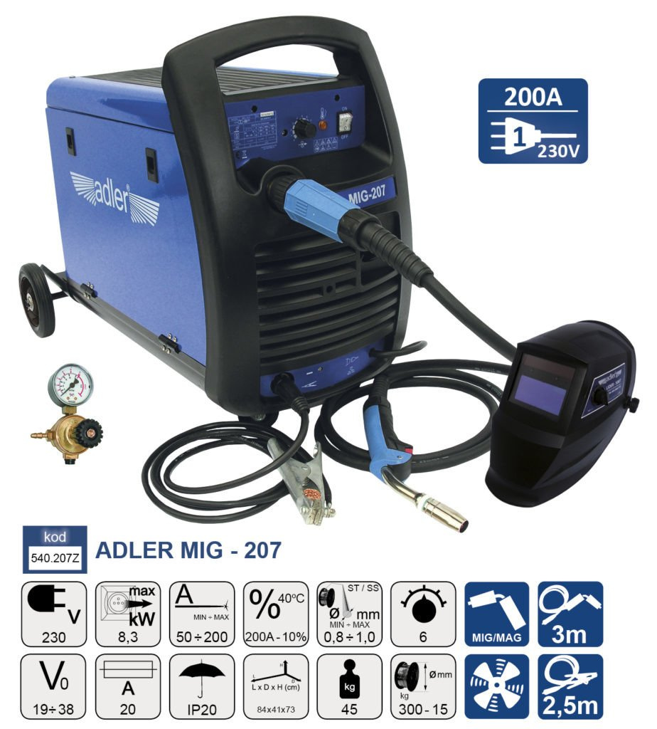 Urządzenie Adler MIG-207 posiada płynną, bezstopniową regulację prędkości podawania drutu oraz sześcio-stopniową regulację prądu spawania. Zastosowanie gniazda EURO pozwala na podpięcie każdego przewodu MIG z EURO złączem bez konieczności demontażu urządzenia. Możliwość spawania dużymi szpulkami drutu 300mm, 15kg.