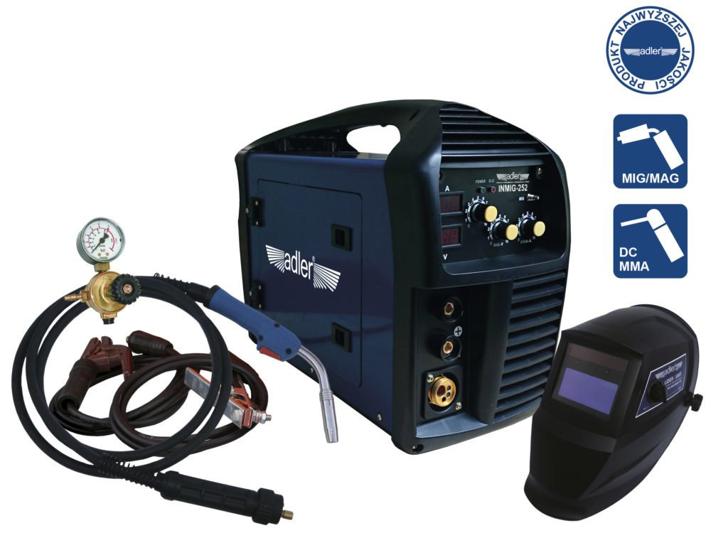Adler INMIG-252 posiada płynną, bezstopniową regulację napięcia i natężenia prądu oraz prędkości podawania drutu. Wyposażona jest w dwa wyświetlacze LCD umożliwiające ciągłą kontrolę parametrów pracy.