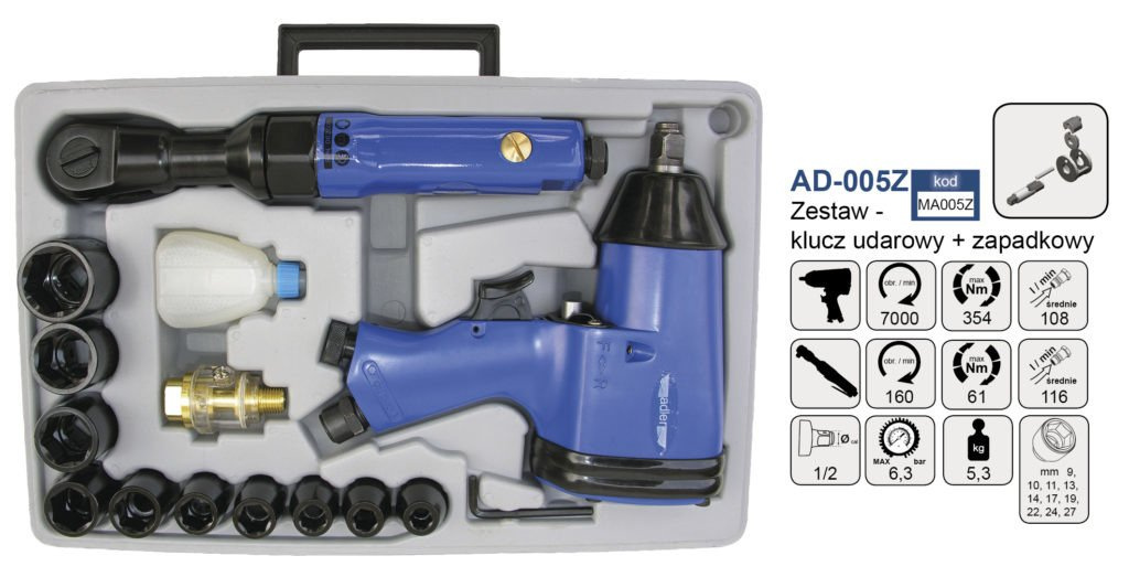 - Średnie zużycie powietrza klucza zapadkowego: 116 l/min