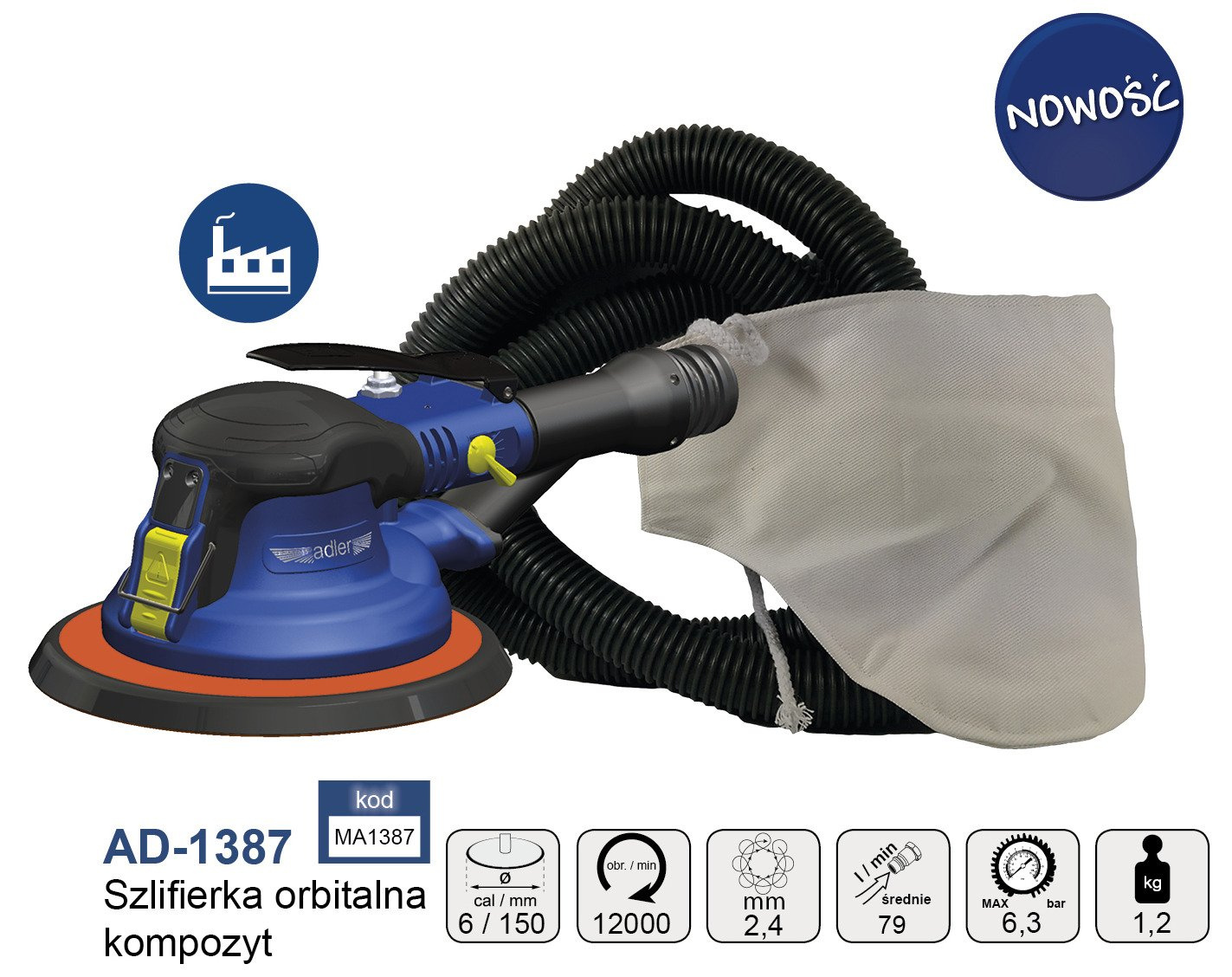 Przedstawiamy profesjonalną bezolejową szlifierkę orbitalną do zastosowań przemysłowych, najwyższy model w naszej ofercie AD-1387.