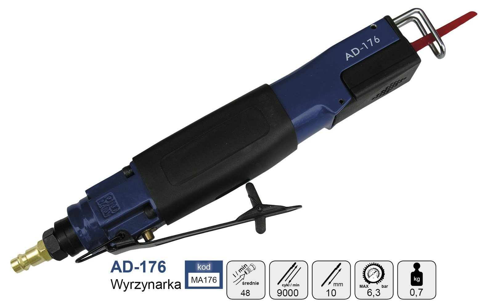 Pneumatyczna wyrzynarka AD-176 jest przeznaczona do cięcia metali, drewna, tworzyw sztucznych i produktów z włókien szklanych. Doskonale sprawdza się przy pracach blacharskich.