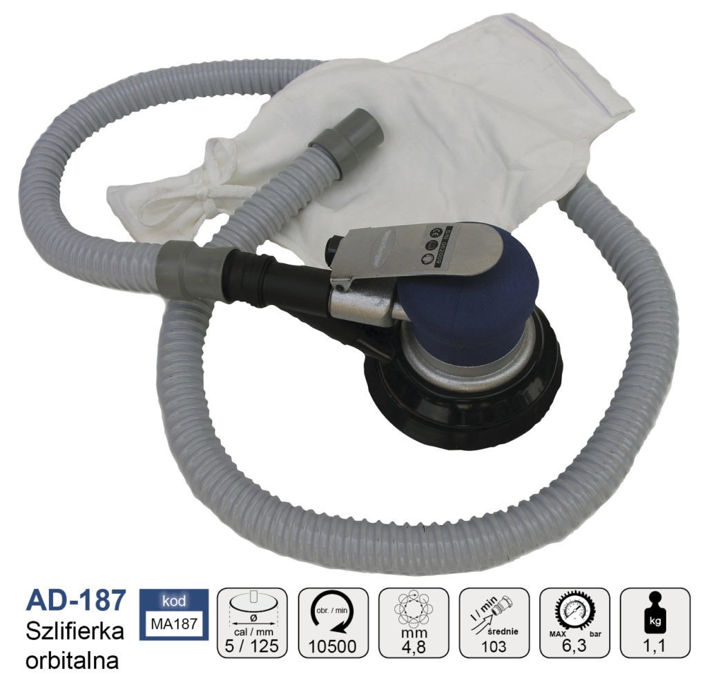 Silnik pneumatyczny zapewnia obroty rzędu 10500 na minutę przy jednoczesnym zmniejszeniu konsumpcji powietrza. Model AD-187 posiada profesjonalną głowicę oscylującą obracającą się na mimośrodzie, skok oscylacji w tym modelu to 4,8mm, dzięki temu podczas szlifowania nie powstają charakterystyczne dla szlifierek bez tej funkcji okręgi.