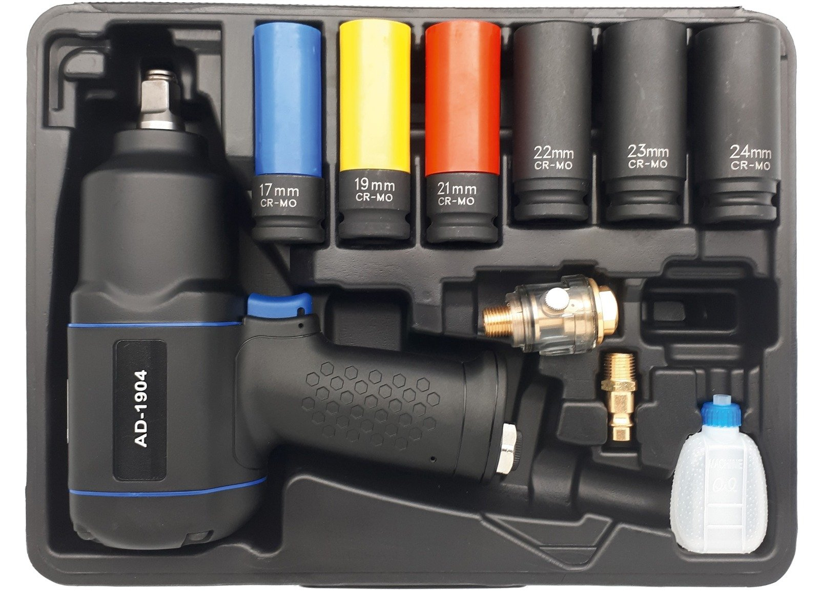 AD-1904-Z6 posiada walizkę z tworzywa sztucznego ułatwiającą transport i przechowywanie klucza. W zestawie 3 sztuk długich nasadek udarowych z osłonami teflonowymi do bezpiecznego montażu i demontażu felg aluminiowych, 3 nasadki udarowe długie, mini olejarka, olej do narzędzi oraz klucz hex.