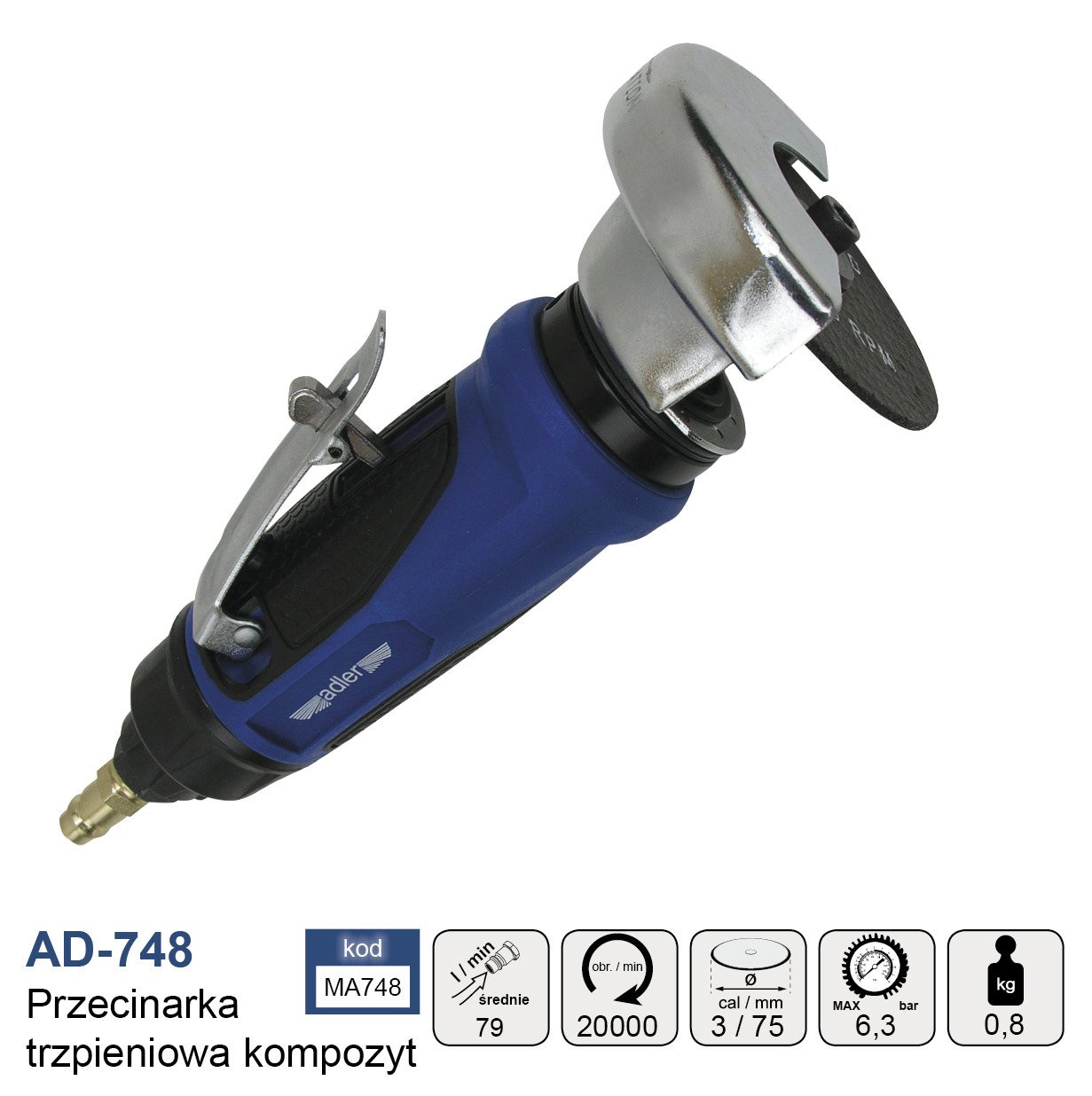Zaletami modelu AD-748 są: lekka kompozytowa obudowa oraz obrotowa osłona dysku. Przecinarka wyposażona jest także w pokrętło regulujące liczbę obrotów na zasadzie dławienia przepływu powietrza.