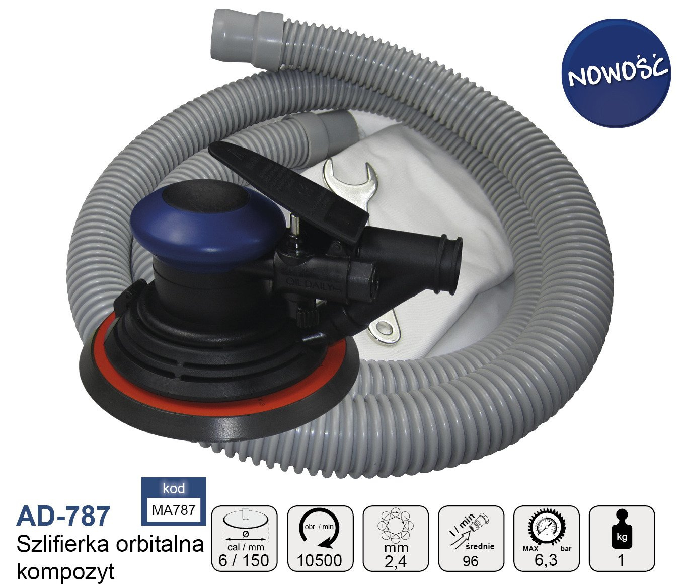Wysokiej klasy silnik pneumatyczny zapewnia obroty rzędu 10500 na minutę przy jednoczesnym zmniejszeniu konsumpcji powietrza. Model AD-787 jest wyposażony w profesjonalną głowicę oscylującą obracającą się na mimośrodzie, skok oscylacji w tym modelu to 2,4 mm, dzięki temu podczas szlifowania nie powstają charakterystyczne dla szlifierek bez tej funkcji okręgi.