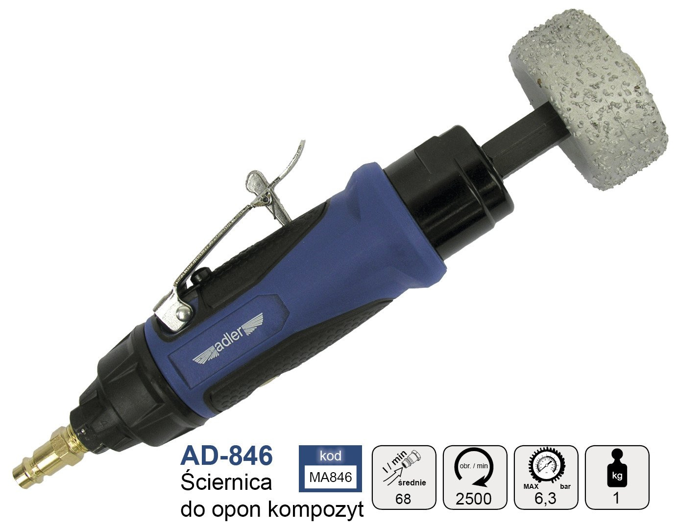 Pneumatyczna ściernica do opon AD-846 służy do mechanicznego szorstkowania powierzchni opony. Poprzez zabieg szorstkowania można usunąć takie defekty opony jak nierównomierne zużycie, wyząbkowanie lub wycie opony. Ściernica AD-846 zdecydowanie przyda się w każdym wartszacie wulkanizacyjnym.