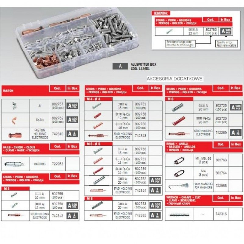 Na wyposażeniu zestaw narzędzi do zgrzewania punktowego trzpieni gładkich i z zewnętrznym gwintem.