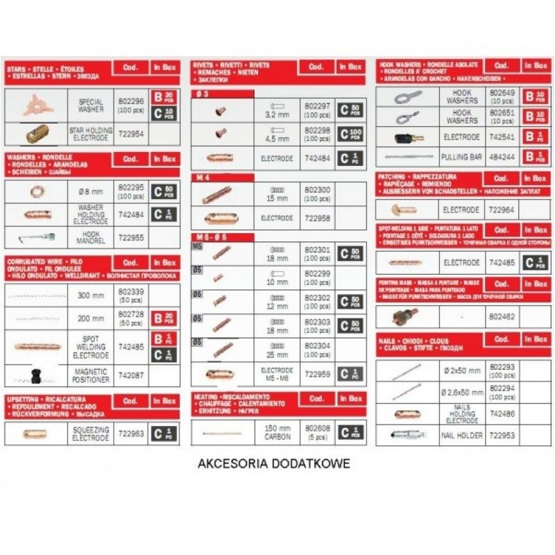 W skład zestawu wchodzi: Urządzenie, wybijak, masa, pistolet do pullera, uchwyt elektrodowy oraz podkładki trójkątne do zgrzewania.