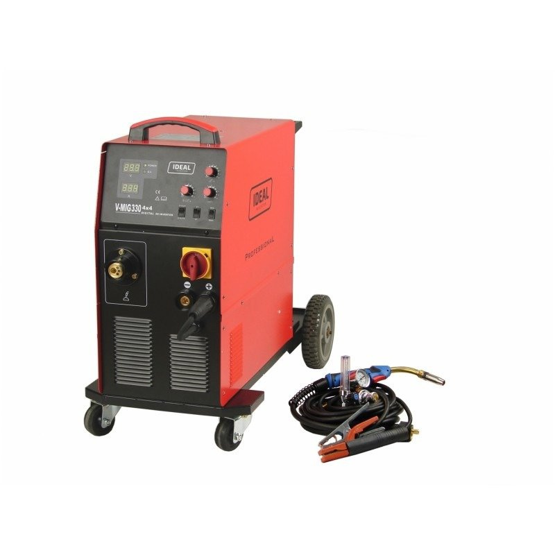 Profesjonalny inwertorowy półautomat spawalniczy do spawania metodą MIG-MAG drutem spawalniczym w osłonie gazu, spawania metodą FLUX oraz metodą MMA. Prąd spawania 330A. Zasilanie 400V. Średnica drutu spawalniczego 0,6-1,2mm. Podajnik drutu 4-rolkowy