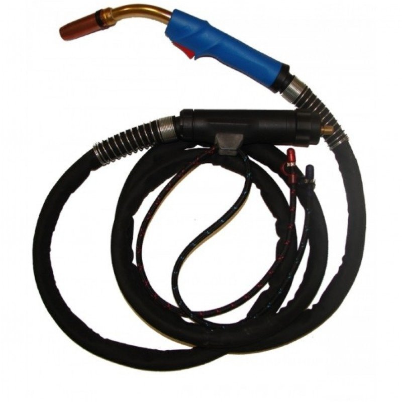 Profesjonalny uchwyt spawalniczy do urządzeń MIG chłodzony cieczą. Prąd spawania dla cyklu pracy 60%: 500A (gaz CO2), 450A (mieszanka Ar/CO2). Długość 3 metry.