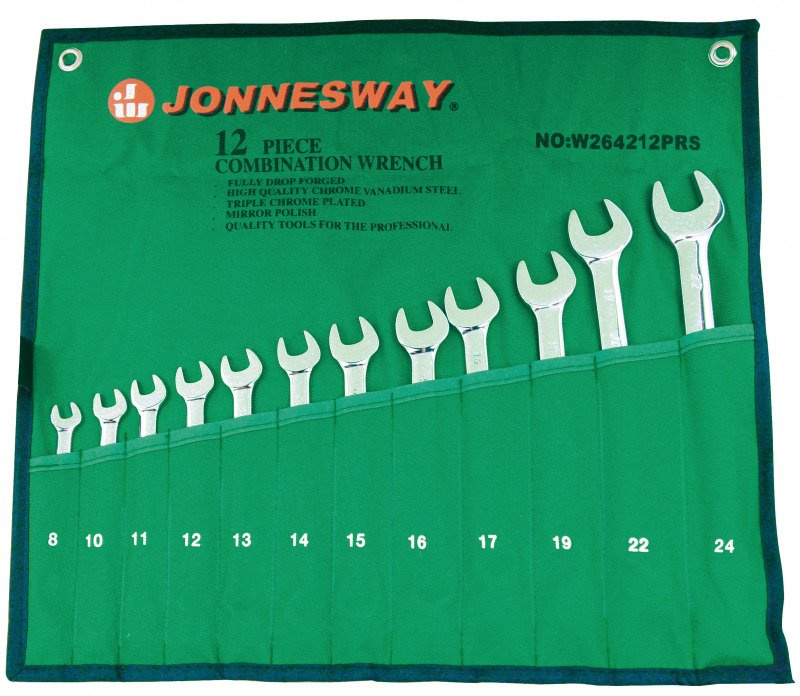 12 szt. kluczy płasko-oczkowych 12-kt. długich w rozmiarach: 8, 10, 11, 12, 13, 14, 15, 16, 17, 19, 22, 24 mm