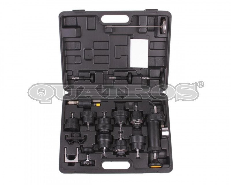 Sprawdź dostępnośćPrzyrząd pozwala na łatwe i szybkie sprawdzenie szczelności układu chłodzenia. Zestaw zawiera korki i adaptery do wielu różnych marek samochodów. Test szczelności polega na dobraniu odpowiedniego adaptera, następnie za pomocą pompki wytworzenia ciśnienia ok. 30PSI i obserwowaniu wskazań manometru przez ok. 2-3min. W tym czasie wartość ciśnienia powinna utrzymywać się na tym samym poziomie.