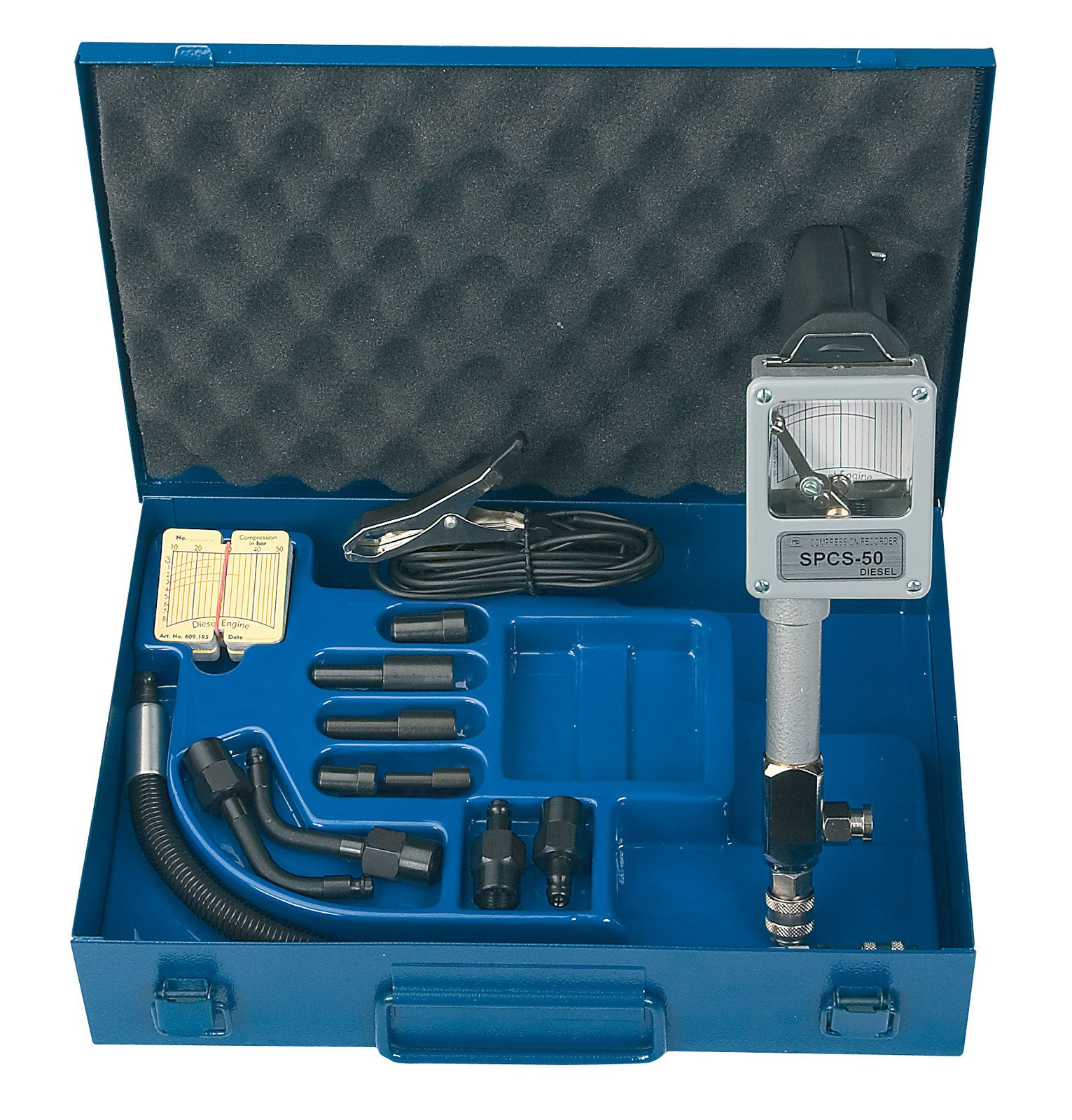 Przyrząd do pomiaru kompresji z uchwytem wyposażonym we włącznik rozrusznika i zaworkiem odpowietrzającym (spustowym) 912 201 00 Wąż ciśnieniowy z zaworkiem zwrotnym dł. 360 mm 912 202 00 Adapter (końcówki pomiarowe) zastępujące rozpylacz: A, B, D, E, F 912 011 - 016 00 Przewody elektryczne do uruchamiania silnika 912 404 00 Złączka kątowa M12 x 1,5 SK 912 203 00 Złączka kątowa M14 x 1,5 SK 912 204 00 Redukcja szybkomocująca M12 x 1,5 SK 912 205 00 Redukcja szybkomocująca M14 x 1,5 SK 912 206 00 Diagramy rejestracyjne 100 sztuk 609 195 00